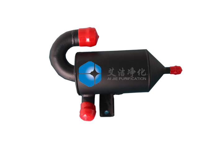 艾潔凈化生產的旋風式油氣分離器是讓氣液混合氣經過切向進氣道或是螺旋進氣道進入分離器內,使混合氣在分離器內旋轉運動,以此產生離心力來實現油滴的分離,它的分離機理與主動離心式油氣分離器相同,只是不需外界提供動力。